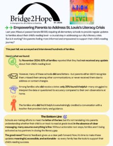 That law was a big step forward. But a law on paper isn’t enough. The Know Your Level campaign exists to make sure this isn’t just a requirement—it’s a real commitment that schools and families across St. Louis take seriously. Because every parent deserves to know how their child is doing. And every child deserves the chance to read—and to unlock the doors that reading can open.