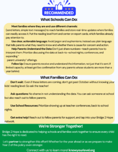 We made a plan to do that from three angles – activating parents to get the info they need, supporting schools to offer it in ways that are helpful, and system/state leaders to provide the resources and accountability to make that easier.